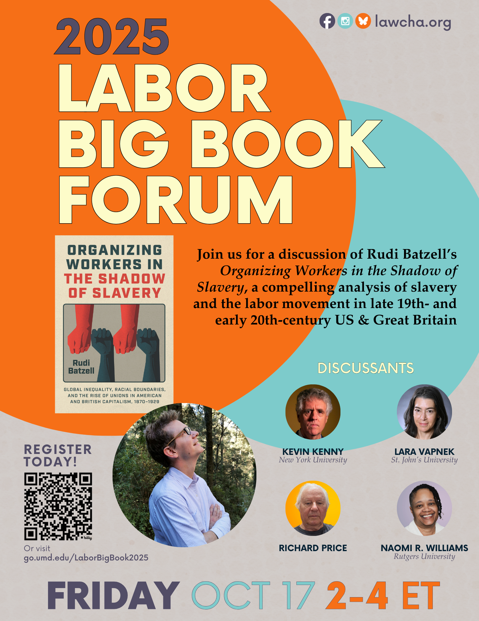 Commentaries will be provided by Lara Vapnek (St. John’s University), Kevin Kenny (New York University), Richard Price (University of Maryland), and Naomi Williams (Rutgers). Julie Greene will moderate. The event is free and open to the public. See the flyer for more information and a QR code, or register for the event at go.umd.edu/LaborBigBook2025https://urldefense.com/v3/__https:/go.umd.edu/LaborBigBook2025__;!!DZ3fjg!7hZDVEjiUBncshBak_iJ0imt8996-KLuoeLIK5gSq5UZNYdo4tCEw1XIavW-l6TuH-4Tk5MFzRi20BUp$. Please share widely.